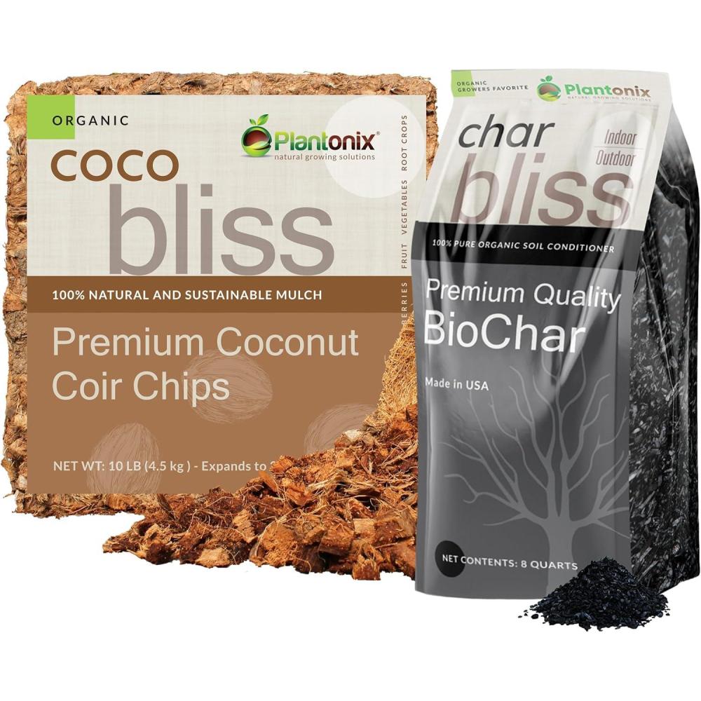 Coco Chips (10lbs) + Char Bliss (8 Qts) – Coco Chips for Plants & Organic Biochar for Plants – Biochar Soil Amendment & Coconut Mulch – Coco Coir Chips – Charcoal for Plants – Garden Soil Potting Mix