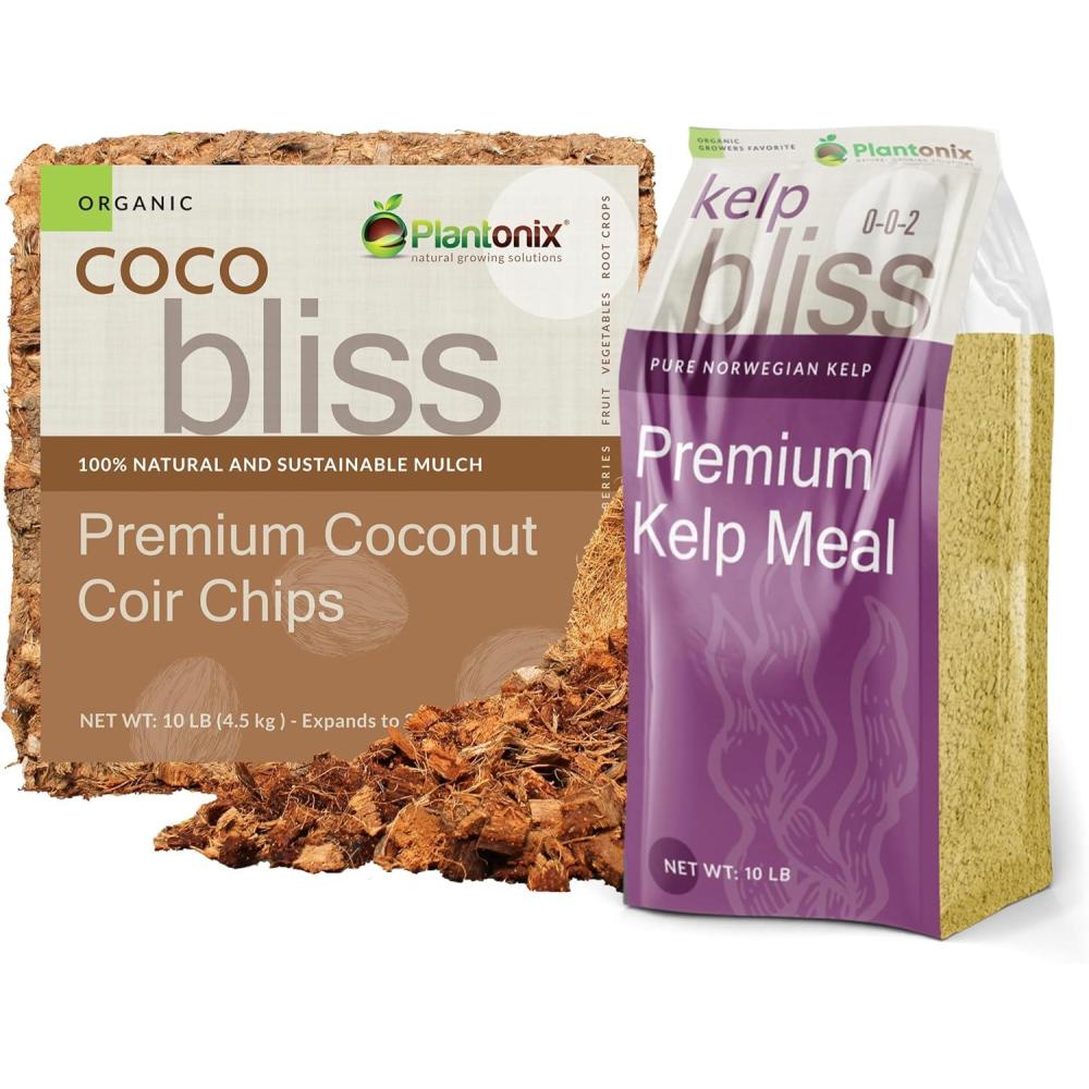 Includes (1x) 10lb brick of Coco Chips organic coconut husk chips for plants and (1x) 10lb bag of Kelp Bliss organic kelp meal fertilizer for plants and gardening.