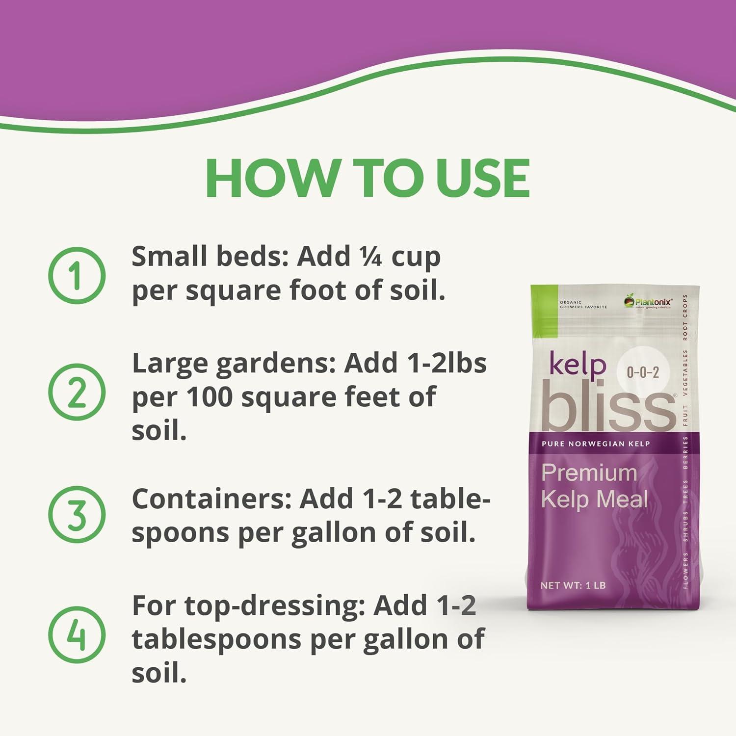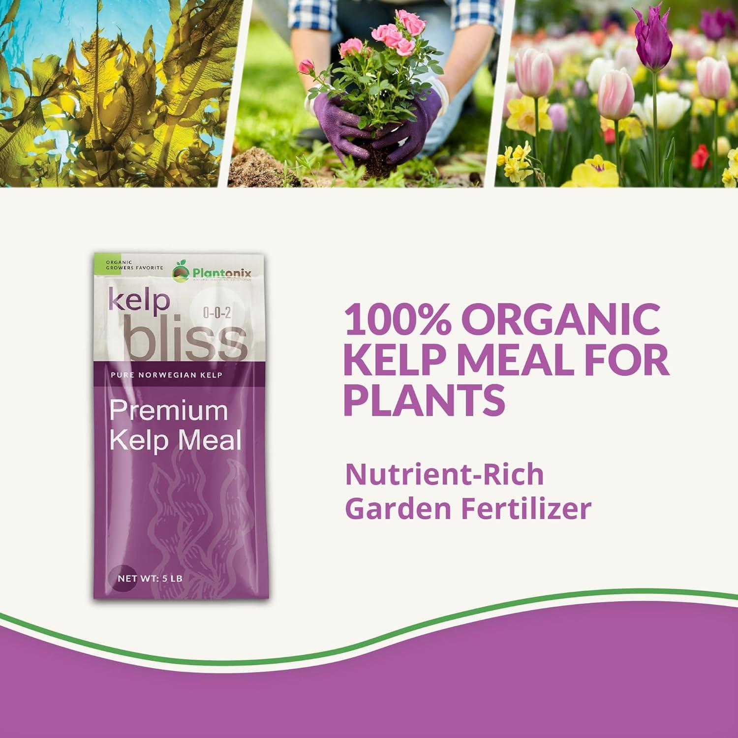Kelp Meal Organic Fertilizer for Gardening – Kelp Bliss is a 100% natural fertilizer and soil amendment for plants that’s been sustainably harvested from sea kelp fresh from the ocean. Kelp meal fertilizer provides essential minerals, vitamins, and trace elements that improve nutrient uptake and encourage soil fertility in indoor plants and outdoor plants.