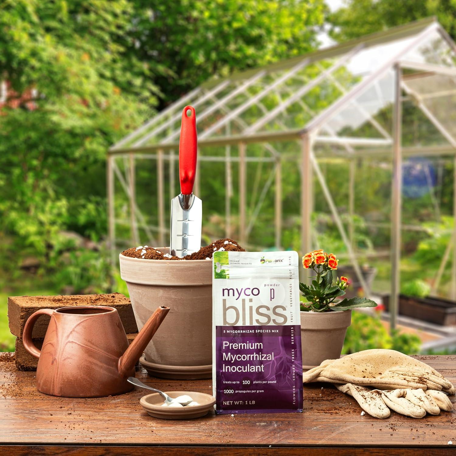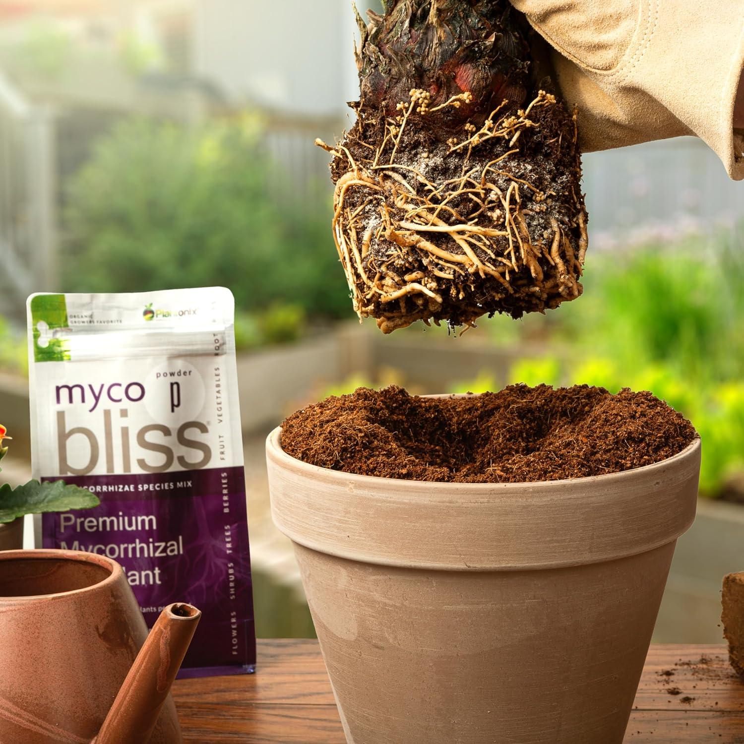 Mycorrhizal Fungi Inoculant for Plants – Myco Bliss contains 5 high performing strains of mycorrhizal fungi that form powerful symbiotic relationships with plant roots, drastically improving nutrient absorption and water retention in indoor plants, outdoor plants, and potting mixes. (Granular Myco Bliss can be applied to soil before sowing or transplanting.)