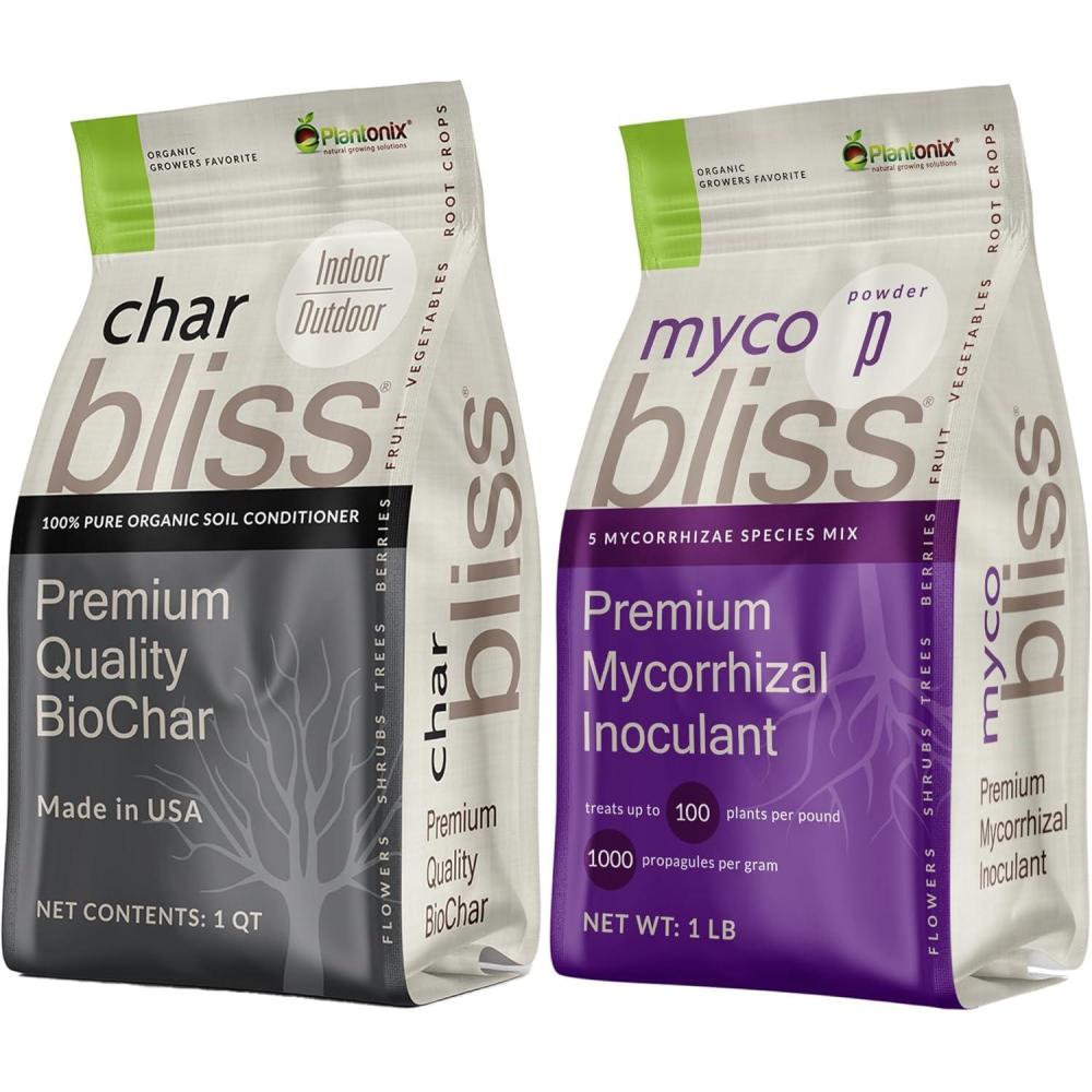 Soil Amendment & Fertilizer for Plants Combo – Combining organic biochar and mycorrhizal fungi for soil greatly improves nutrient uptake and water retention in indoor plants and outdoor plants. Char Bliss slowly releases nutrients into soil, while Myco Bliss forms beneficial bonds with plant roots to help them absorb those nutrients easier and more efficiently.